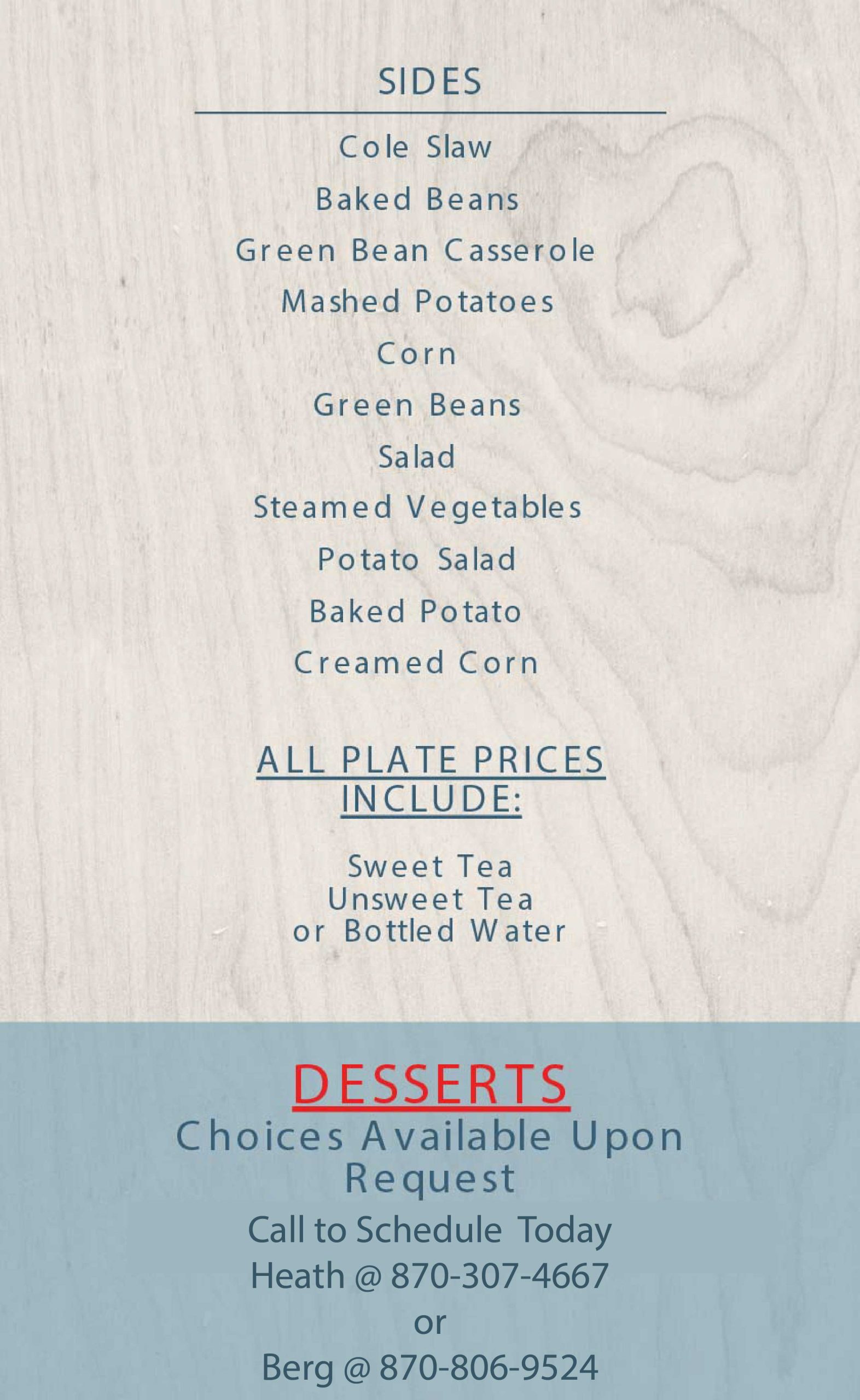 We would love it if you would consider us for your next catering event. Please call Heath at 870-307-4667 or Berg at 870-806-9524.